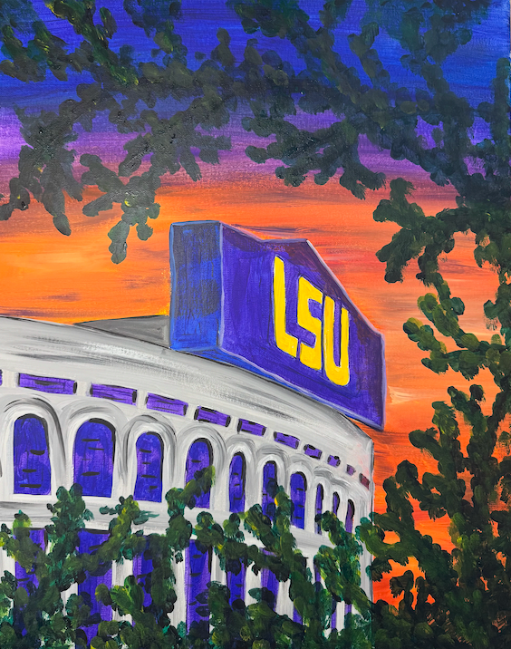 Guests will receive step-by-step instructions from an experienced and enthusiastic local artist as they paint an LSU-themed piece of art on canvas. This year's artwork features Tiger Stadium "through the oaks" under a glowing sunset – view the artwork here. Enjoy mocktails while you paint. Guests are also welcome to bring in their own snacks and outside beverages (alcoholic or non-alcoholic). You'll leave with your own one-of-a-kind creation!